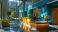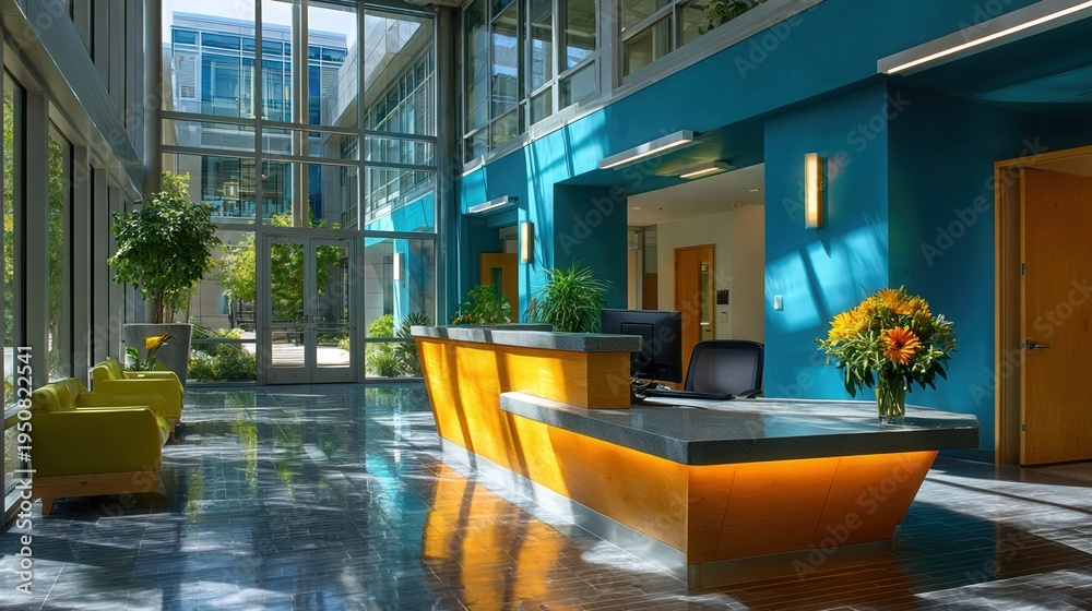 • Modern office lobby with sleek reception desk and vibrant blue walls
