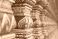 • A close-up, perspective view of the ornate Dravidian pillars at the Sri Maha Mariamman Temple. These stacked structures feature intricate South Indian moldings and decorative bands, most notably a vib