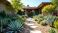 • Front yard xeriscape garden with stone path leading to house entrance. Drought-tolerant plants like agave and succulents create a water-wise landscape. Gravel ground covers most of the area.