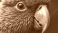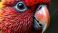 • The image features a close up of a bird's head, highlighting its vibrant red feathers that cover most of its face