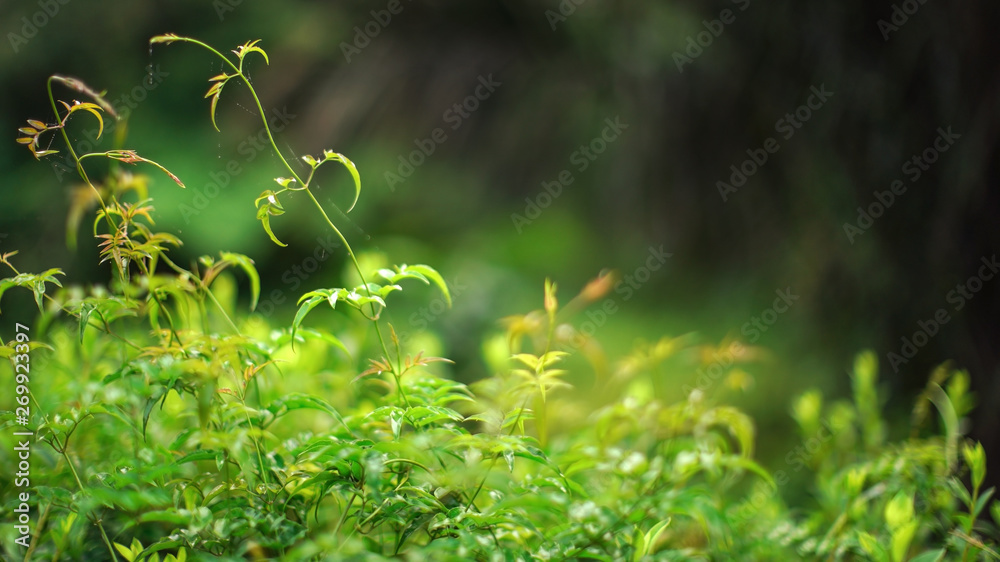 Naklejka do Sypialni - Shallow depth of field photo - only few leaves in focus - morning dew on bright green foliage,... #269923397