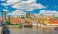 • Panorama of Prague city historical centre with Prague Castle, St. Vitus Cathedral in Hradcany district, view from Charles Bridge Karluv Most across Vltava river. Blue sky white clouds, Czech Republic