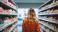 • A woman with long blonde hair walks down a pharmacy aisle. The shelves are filled with bottles of medicine, most of them in various shades of blue, white, and orange.