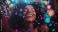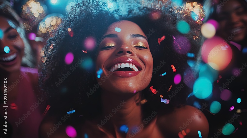 • Friends laughing and dancing in a New Year party with confetti and disco ball lights