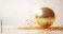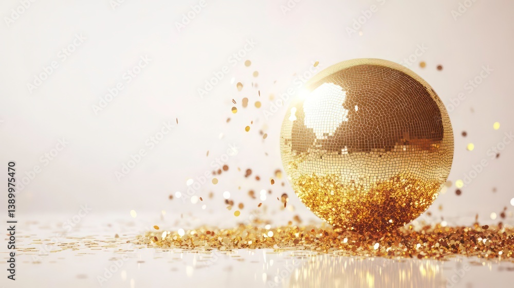 • Shiny gold disco ball on white background. Party atmosphere. Celebration decoration. Nightclub or music event concept. Glittering sphere. Gold confetti. Ideal for disco themes. Stylish party element.