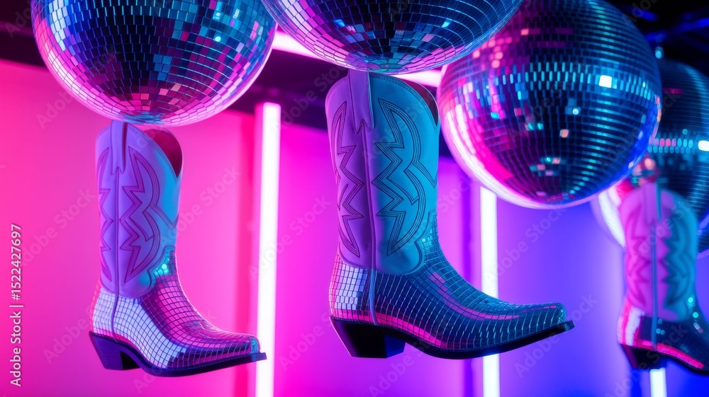 • Cowboy boots and disco ball. Vibrant pop culture, modern Y2K aesthetics, glam western.
