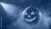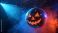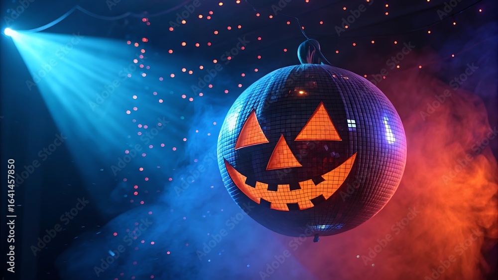• Halloween disco ball pumpkin with spooky face glowing under party lights and smoke