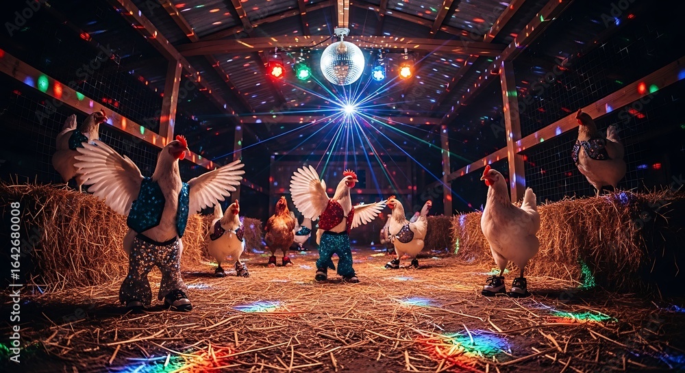 Naklejka do Szkoły Tańca - Whimsical barnyard scene with illuminated disco ball and festive colorful lights illuminating... #1642680008