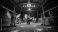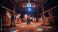 • Whimsical barnyard scene with illuminated disco ball and festive colorful lights illuminating hanging poultry and hay bales