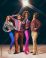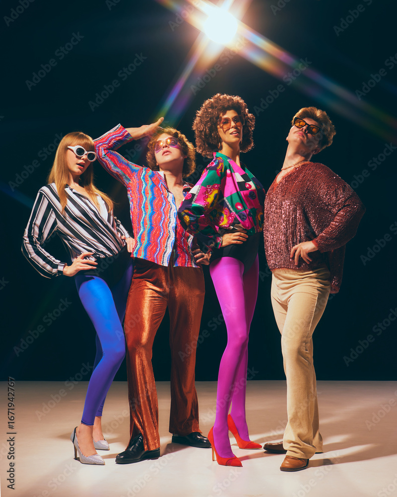 Naklejka do Szkoły Tańca - Retro group in disco outfits posing under spotlight with glam energy. Concept of vintage fashion,... #1671942767