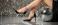 Naklejka do Szkoły Tańca - Woman's legs in stylish black high heels with pink ankle straps relaxing next to a shimmering... #1766858633