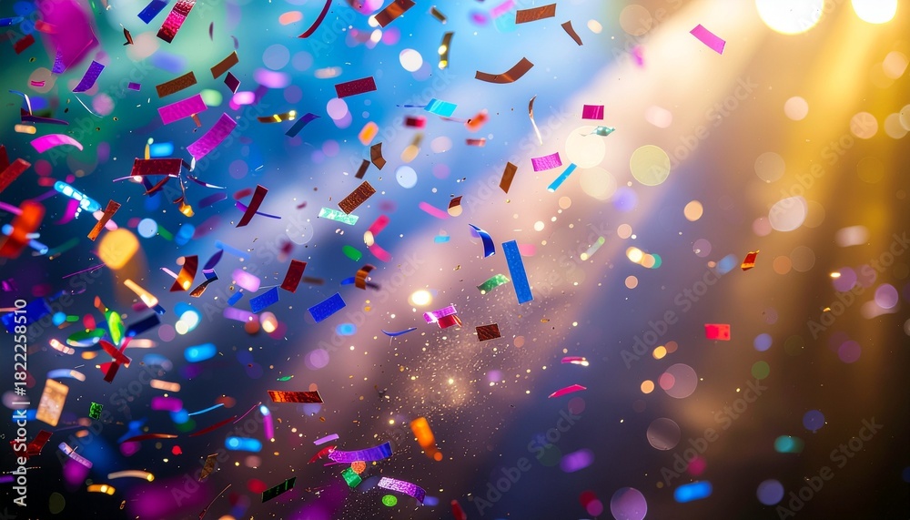 • Vibrant Confetti Falling at a Lively Celebration with Bright Stage Lights and Dynamic Atmosphere.