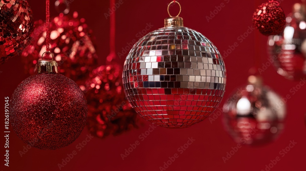 • Red glitter and mirrored disco ball Christmas ornaments suspended on a vibrant red background