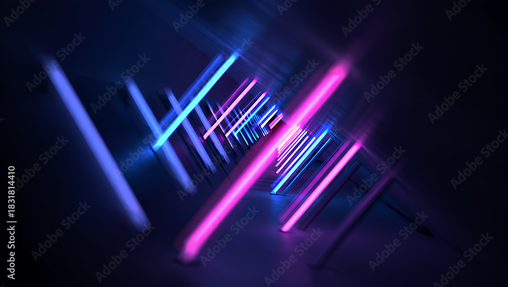 • Futuristic sci-fi tunnel with glowing pink and blue neon lights creating a dynamic abstract background.