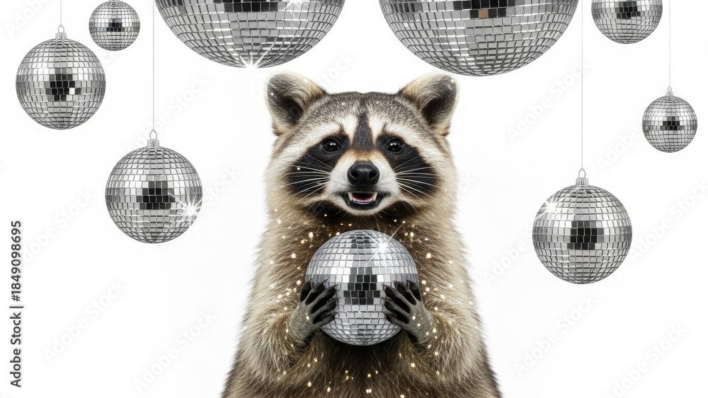 • raccoon with a mirrored disco ball, party celebration, on a white background, party animal photo