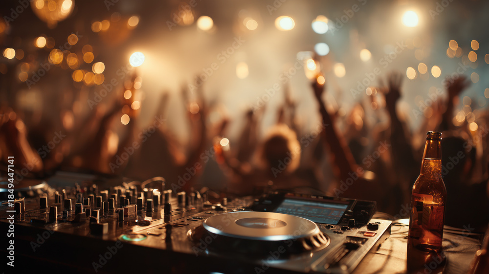 • Exciting party dj console mixer controller playing music for happy crowd dancing nightlife entertainment celebration concert event club