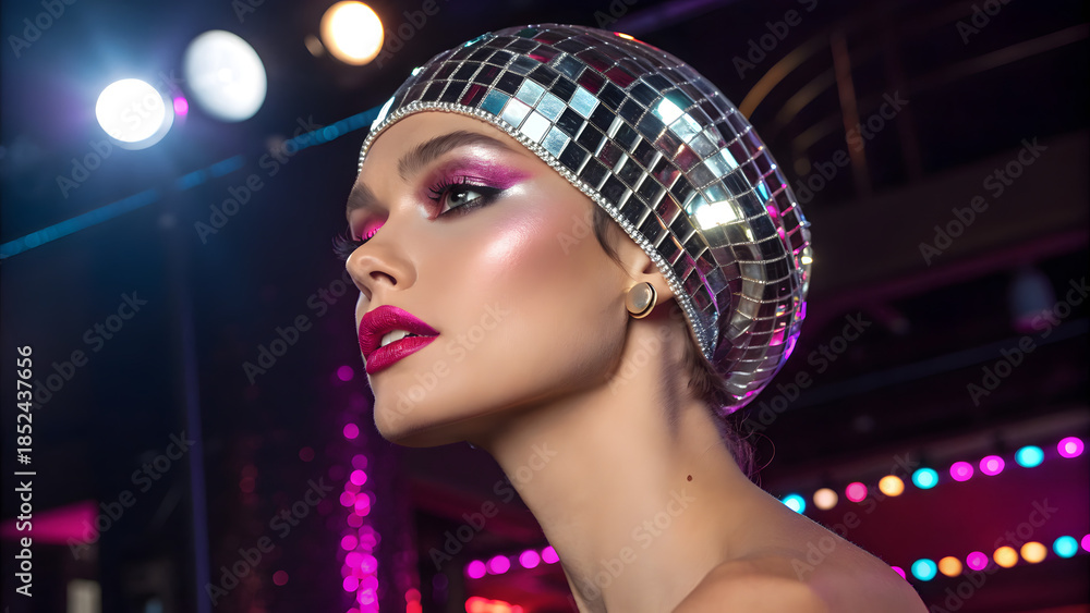 • Glamorous fashion portrait featuring a woman in mirrored disco headgear and glossy pink lips. A vibrant and retro-futuristic expression of nightlife and beauty.