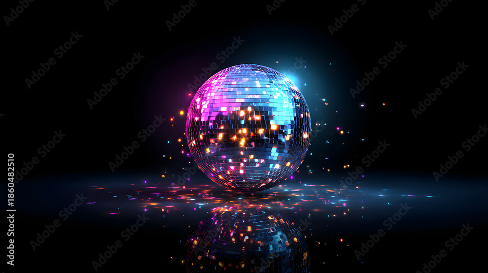 • Large disco ball reflecting colorful specular light on a plain empty black background