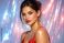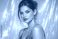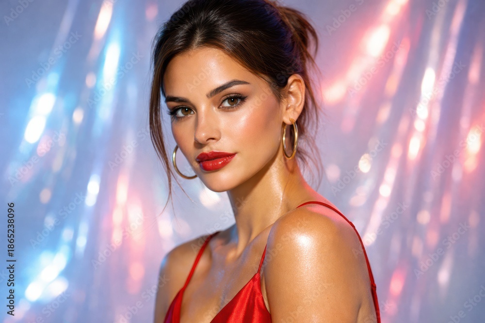 • A stunning brunette with glowing skin and red lips poses against a shimmering backdrop of blue and pink lights, exuding festive glamour and confidence.