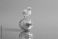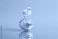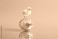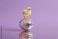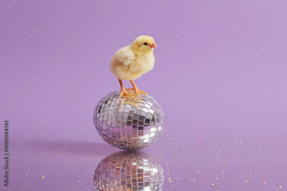 • Tiny yellow chick standing on mirrored chrome disco-ball Easter egg in innocence and glamour on lavender background