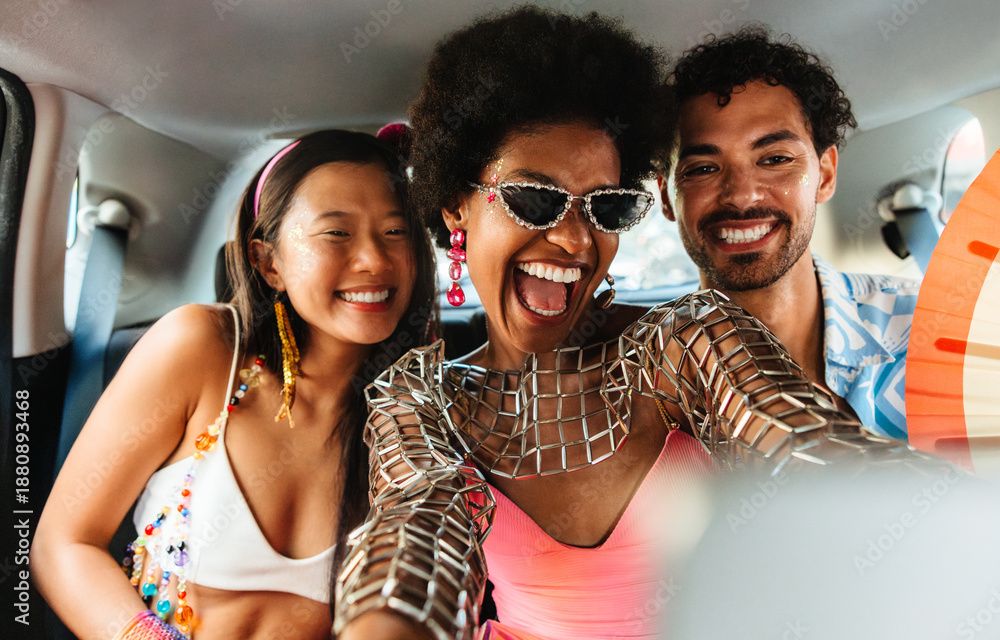 • Friends celebrate Brazilian carnival in a festive car