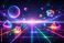 • Retro futuristic neon grid with geometric shapes and disco ball