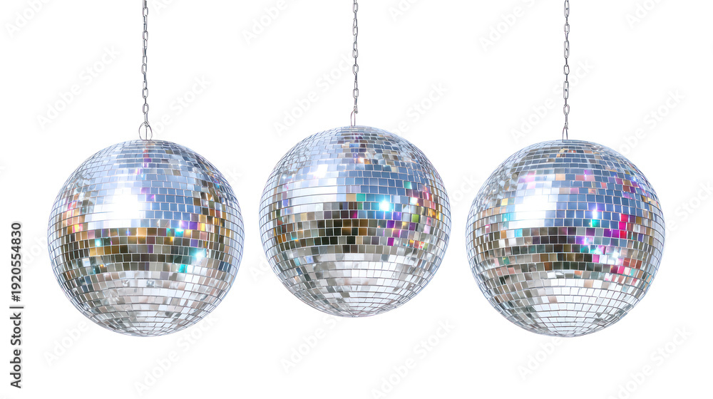 • Three shiny disco balls hanging from the ceiling on transparent background