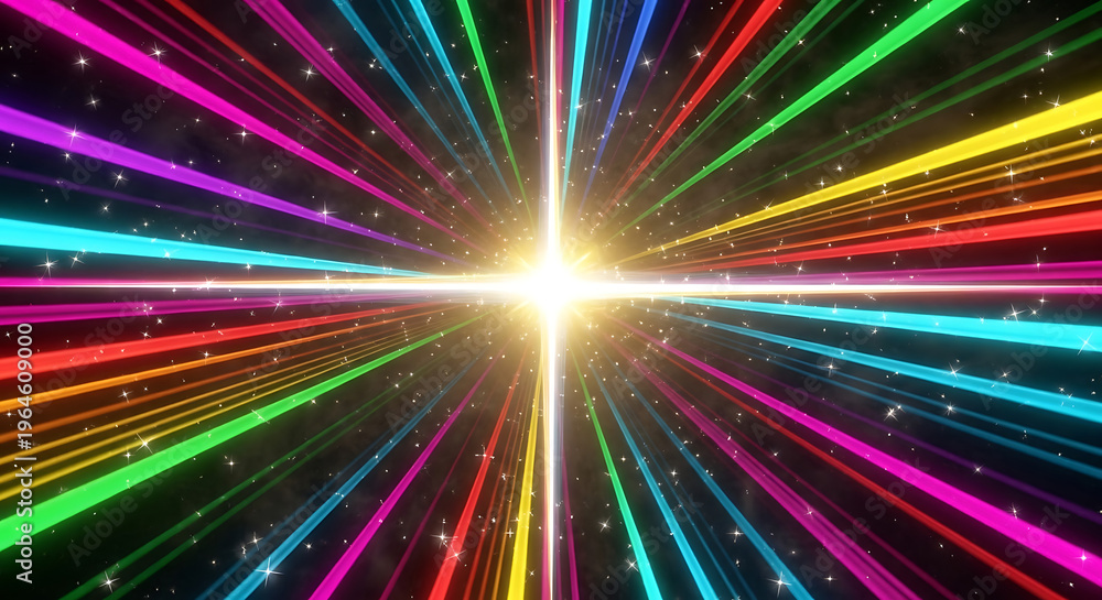 • Multicolored light streaks radiating from bright center as an abstract background, dynamic rainbow lines with energy and speed