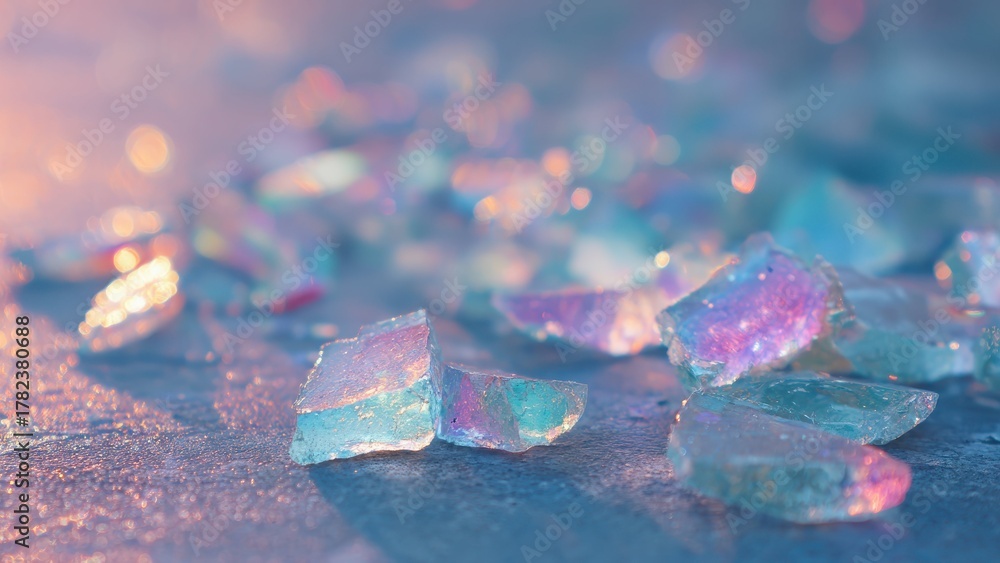 • 虹色に光るガラス片のマクロ背景 幻想的な光のアート素材