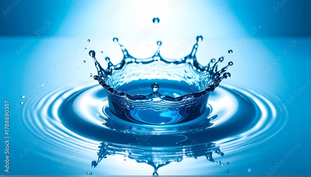 • 水 水滴 波紋 王冠 クラウン 飛沫 スプラッシュ 青 ブルー 透明 清潔感 清涼感 爽やか 静止画 マクロ 一瞬 インパクト 流体 ダイナミック シンプル