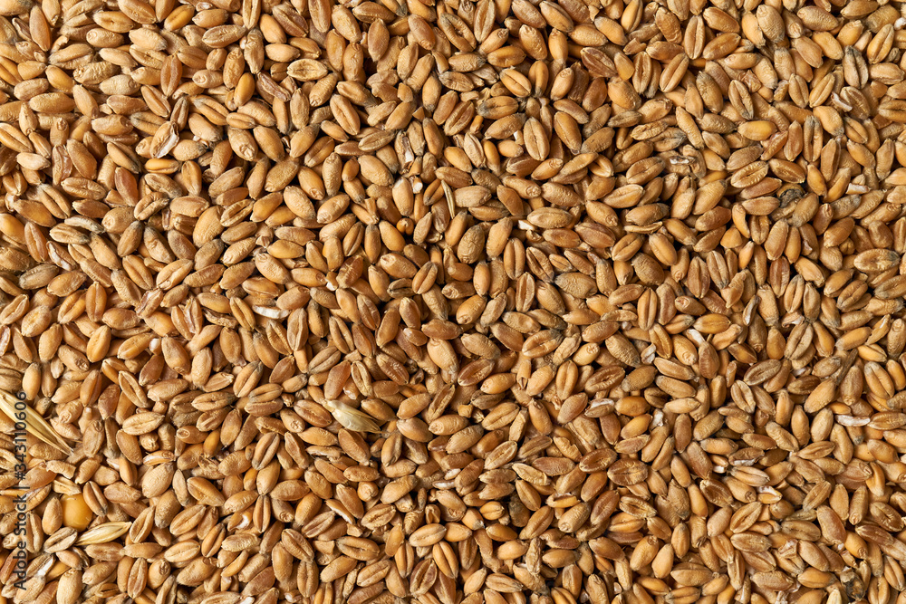 • Ziarna przenicy rozsypana na całej powieżchni, zbliżenie makro
