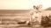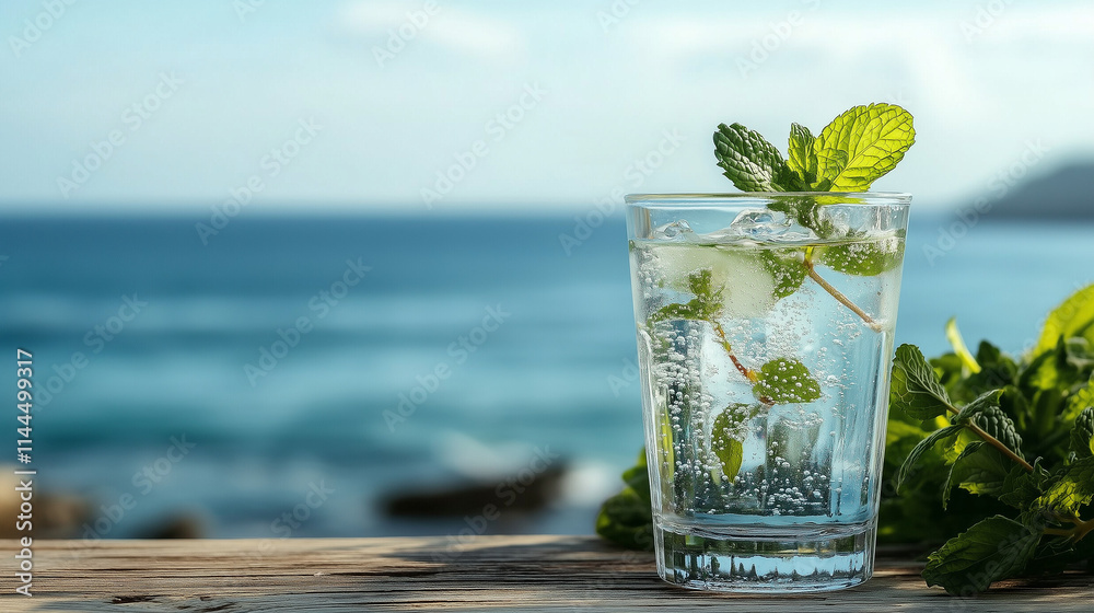 • Orzeźwiająca szklanka wody z miętą na rustykalnym stole, na tle błękitnego morza i słonecznego wybrzeża.