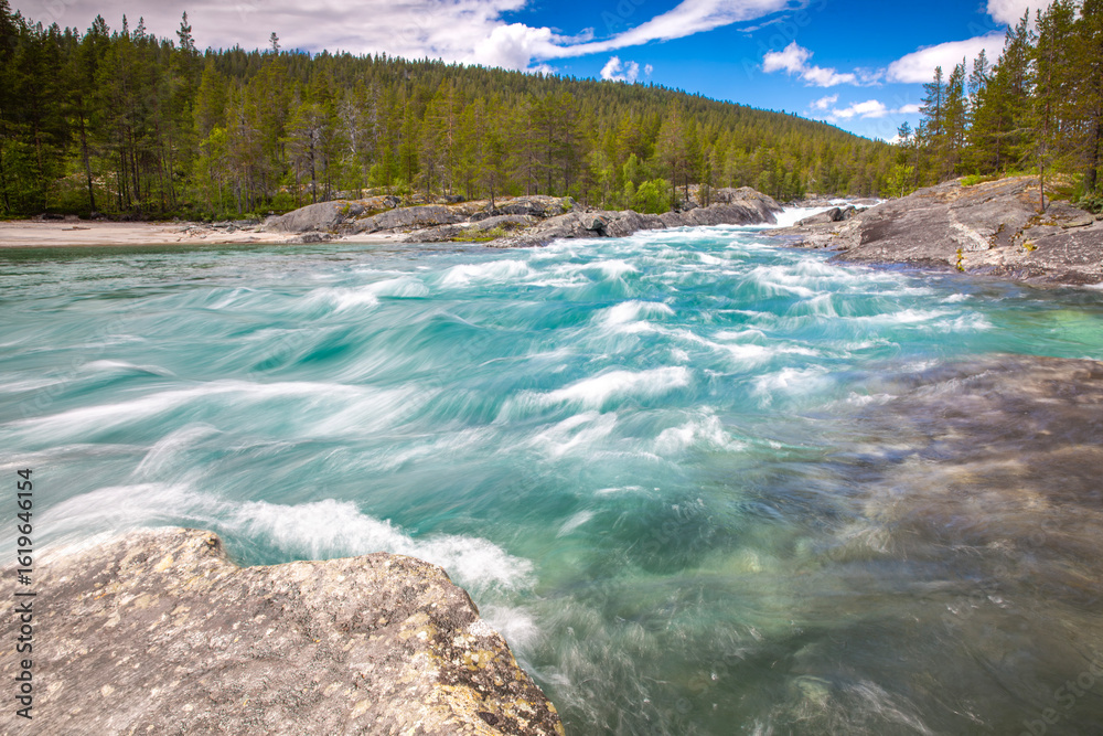 • Rwąca krystalicznie czysta górska rzeka w pogodny letni dzień