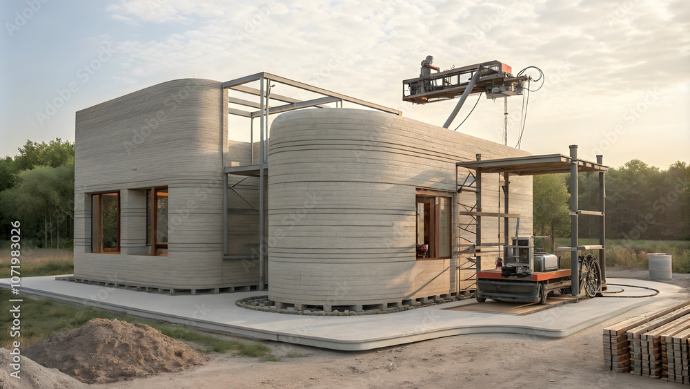 • modern 3D printed house under construction, showcasing innovative architecture and technology. structure features curved walls and large windows, surrounded by natural landscape