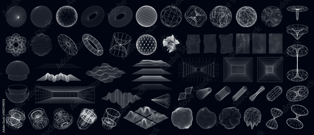 • Futuristic 3D Sci-fi elements. Geometric spheres with glitch and liquid effect, wireframe 3d spaces, mechanical drawings, Sci-fi objects, landscape of the area. Universal geometric shapes. Vector