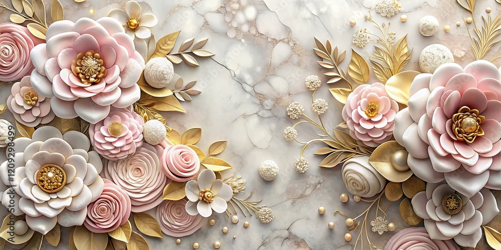 • Elegant Pink, Gold & White 3D Floral Wallpaper Design on Marble Background