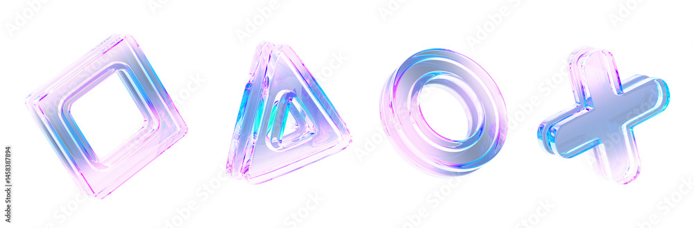 • 3d glass holographic transparent square, triangle, circle, cross on light background render icon set. Abstract geometric shapes with rainbow color effect, neon pink blue gradient