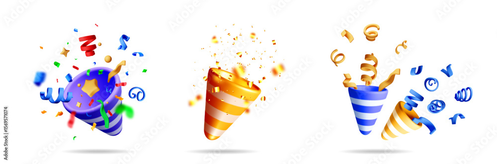 • 3d vector collection of three party poppers with exploding colorful confetti and ribbons for celebration event.