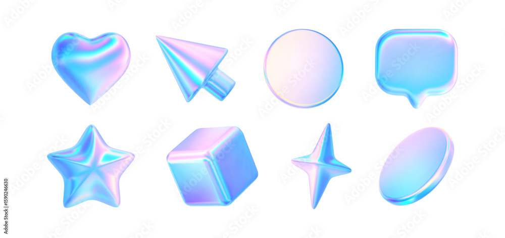 • 3d glass element with holographic neon effect. Render iridescent star, coin, heart, arrow update, cursor, speech bubble, cube icon. Y2k neon shape isolates. Vector tech ui illustration