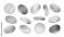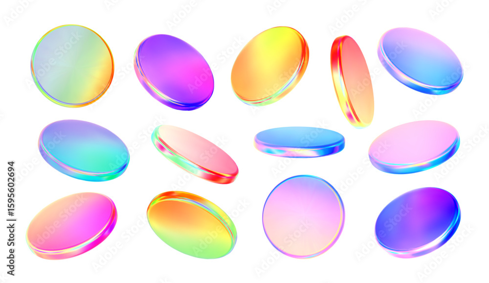 3d glass disk shape hologram effect. Render abstract neon coin set. Fly round podium, disc, badge, lens, plate crystal isolation. Y2k hologram shape. Vector trendy illustration od 0,00 zł Dopasuj i kup
