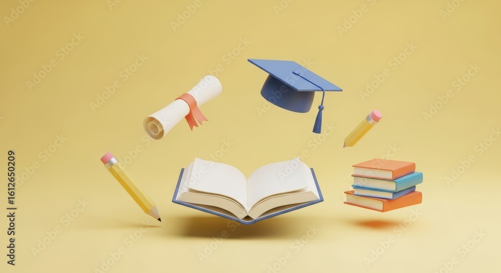 • 3d render education concept with floating books, graduation cap, diploma, and pencils