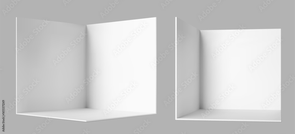 • 3d white corner walls and floor of empty room, booth stand and cube box vector mockup. Realistic interior design corner room walls, studio, showroom or exhibition display stand front and side view
