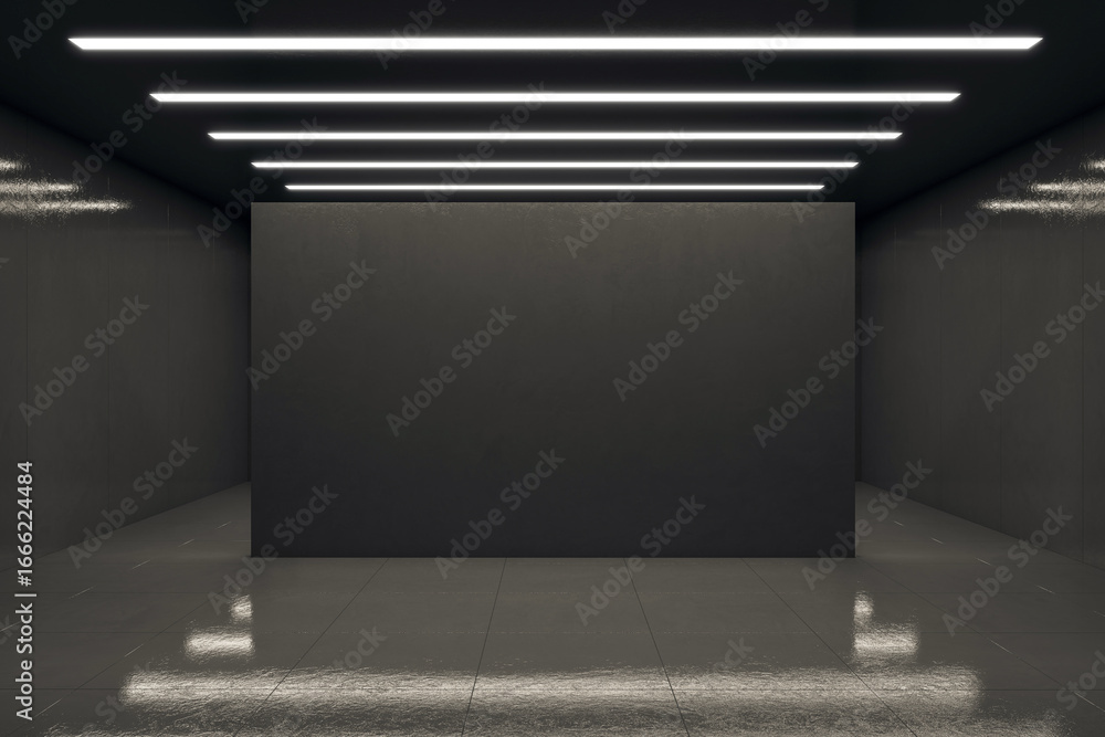 • Dark modern empty room with blank wall and ceiling lights for mockup display in exhibition or showroom presentation background template. 3D Rendering