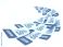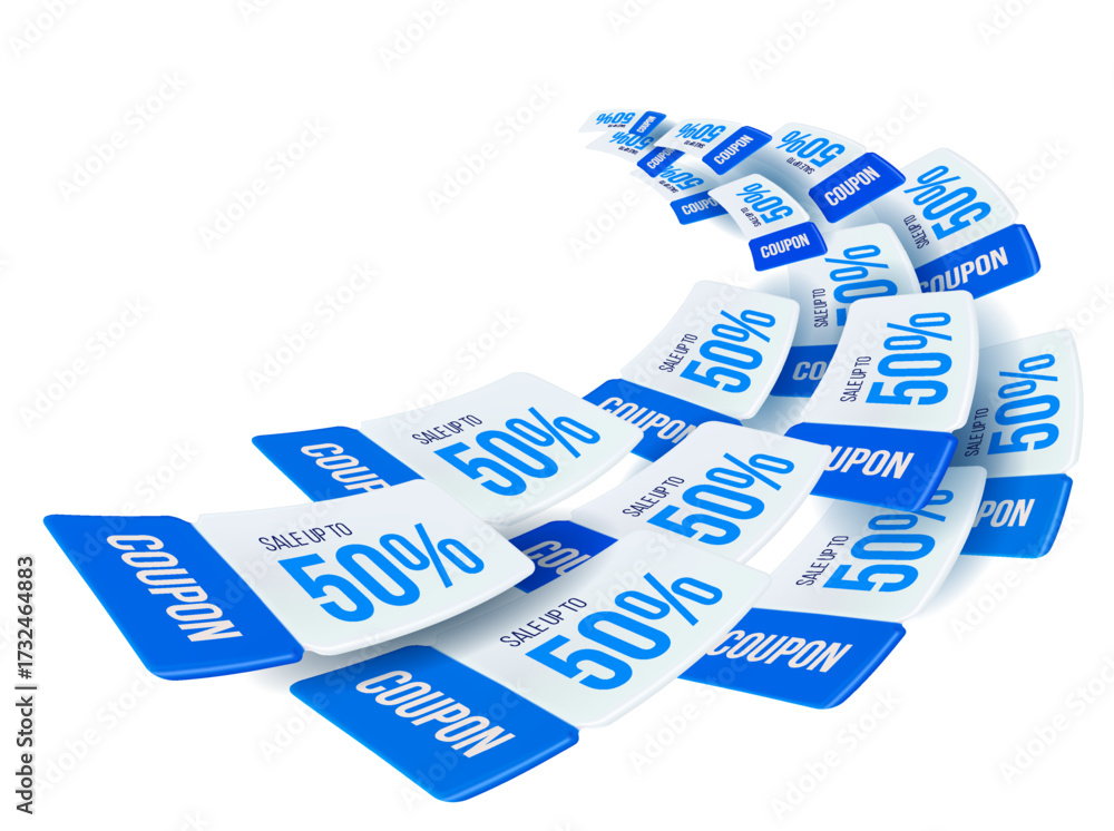 • 3d wave of blue flying gift vouchers or coupons with coupon code, 50% off, isolated on white background. Flying discount vouchers template in 3d vector illustration. Vector illustration