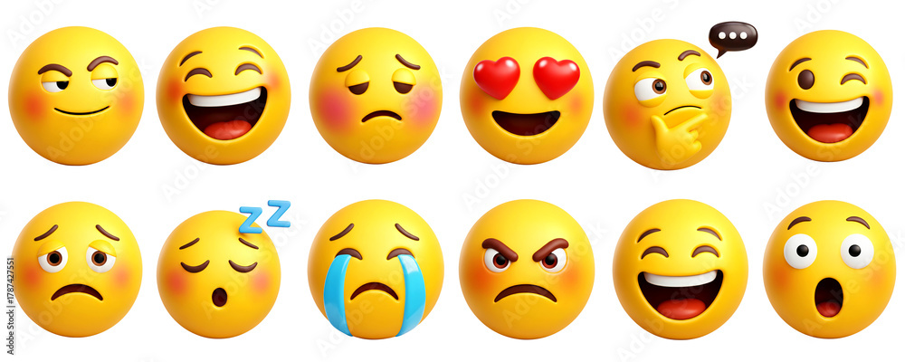 • 3D emoji icon set. Collection of yellow emoticons with various facial expressions including happy, sad, angry, love, and sleep. Social media reaction symbols isolated on a transparent background. png
