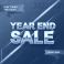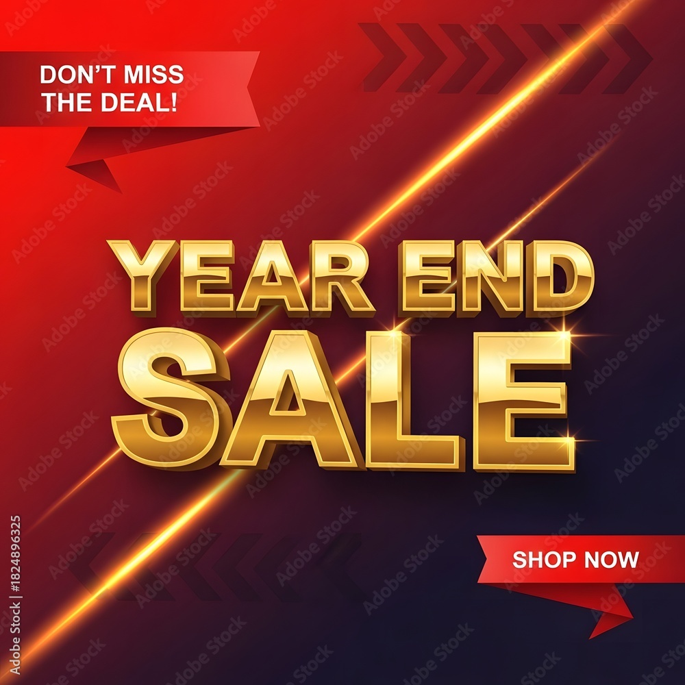 • Year end sale golden 3d text on a vibrant red and dark gradient background with dynamic light effects and promotional ribbons
