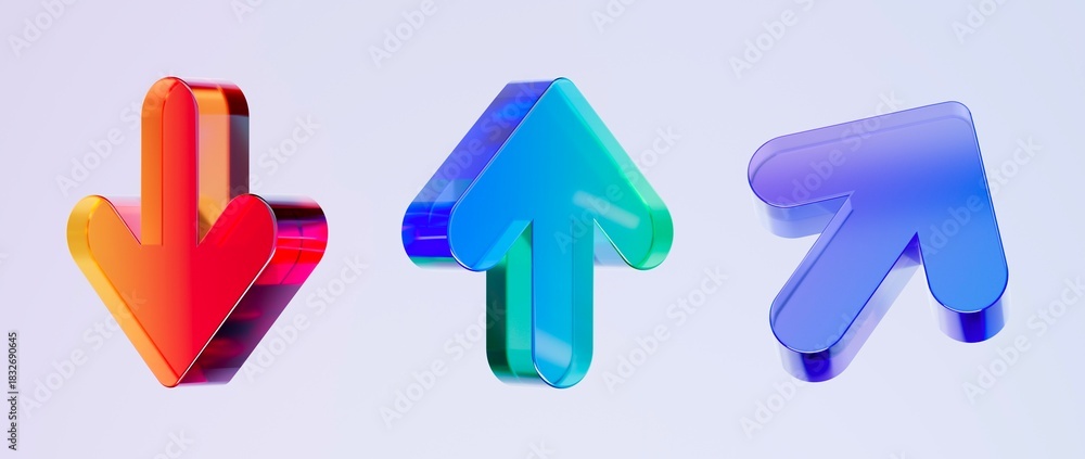 • Set of 3D arrow icons, Colorful gradient glass like icon, glass holographic icon, minimal crystal clear, ideal for graphic design, UI UX interfaces, 3d render illustration.