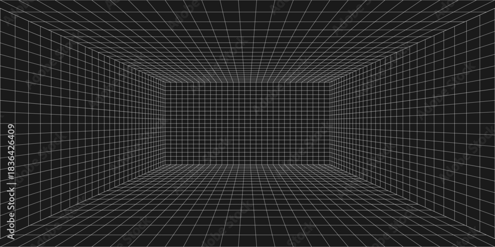 • Room projection grid in futuristic 3d style. Outline futuristic grid background, room projection. Wireframe grid template in perspective view