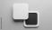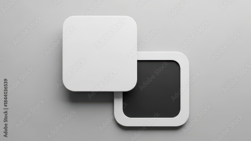 • Stacked rounded square buttons on gray background, minimal 3d render, white and black layers, soft shadow, modern ui icon mockup, copy space, abstract technology concept