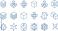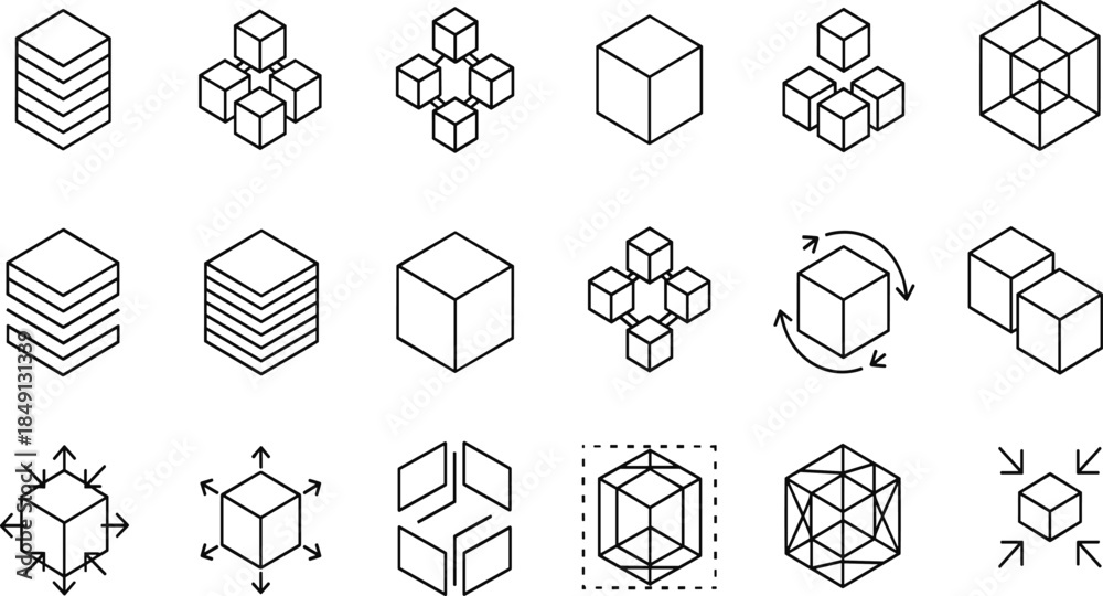 • Isometric cube icons set, modular 3d blocks, geometric construction symbols, abstract volume illustration, spatial structure graphics, technical outline collection, design
